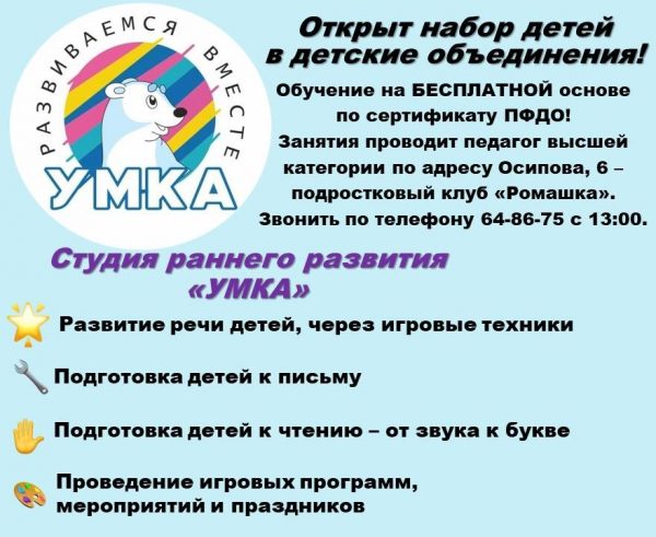 Занятия проходят на базе подросткового клуба “Ромашка” (расположенный по адресу ул. им. В.И. Осипова д. 6) на БЕСПЛАТНОЙ ОСНОВЕ по сертификату ПФДО!