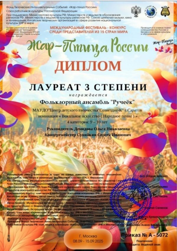 Стали известны результаты Международного онлайн фестиваля-конкурса среди представителей из 15 стран мира “Жар-Птица России”, который проходил в период с 8 по 15 сентября 2025 года в г. Москва.