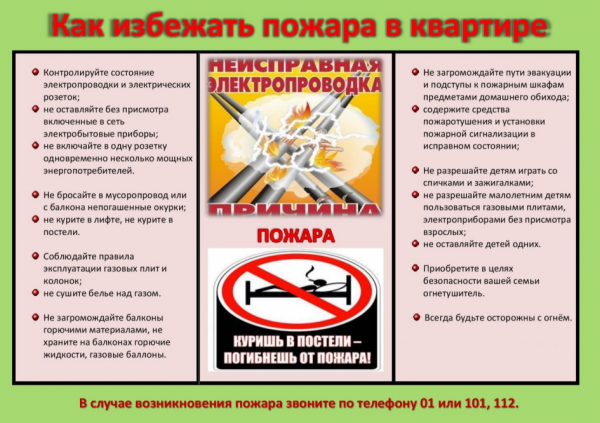 В случае обнаружения пожара, загорания, запаха дыма вызывайте пожарную охрану по телефонам «01» или с мобильного «101».
