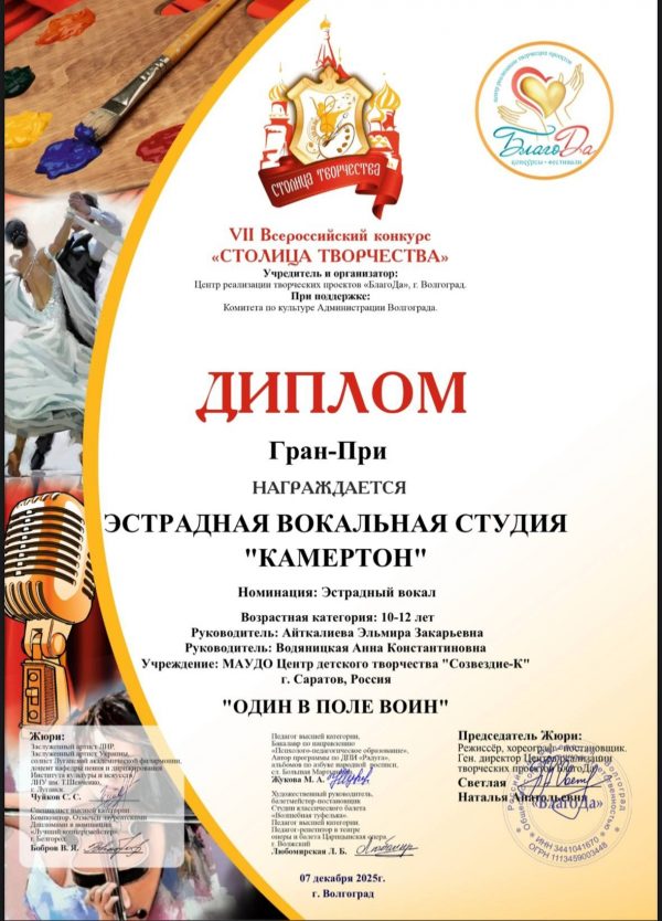 Эстрадная вокальная студия “Камертон” (руководитель Водяницкая А.К., педагог по вокалу Айткалиева Э.З.) КВР “Островок” (расположенный по адресу ул. Техническая д. 14) приняла активное участие в VII Всероссийском конкурсе “Столица творчества”.
