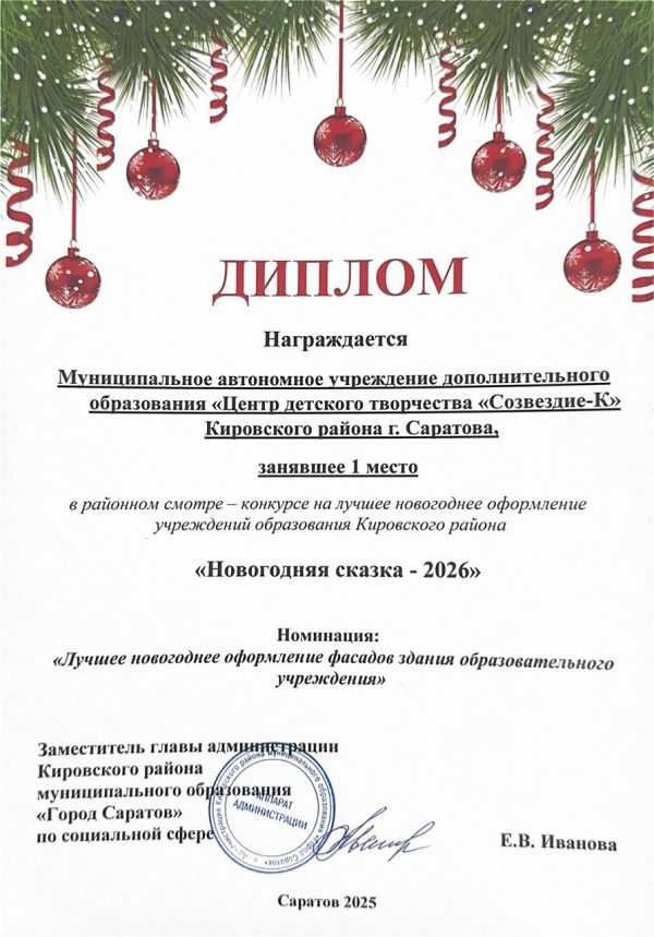 МАУДО ЦДТ “Созвездие–К” Кировского района г. Саратова завоевал 1 место в районном смотре-конкурсе на лучшее новогоднее оформление учреждений. Победа одержана в номинации “Лучшее новогоднее оформление фасадов зданий образовательных учреждений”.