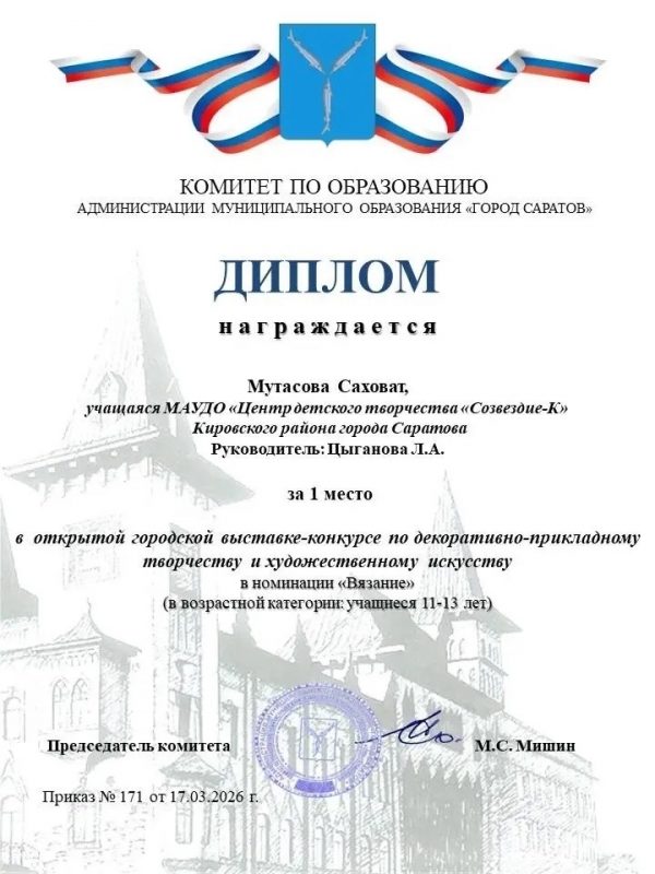 Мутасова Саховат арт-студия “Стильная штучка” (руководитель – Цыганова Л.А.) заняла 1 место в номинации “Вязание” среди учащихся 11–13 лет;
