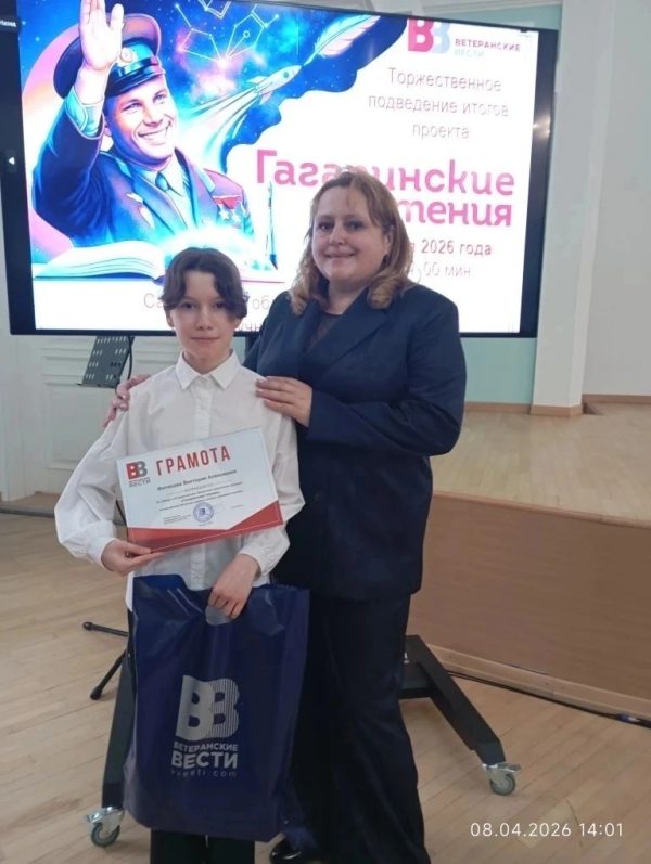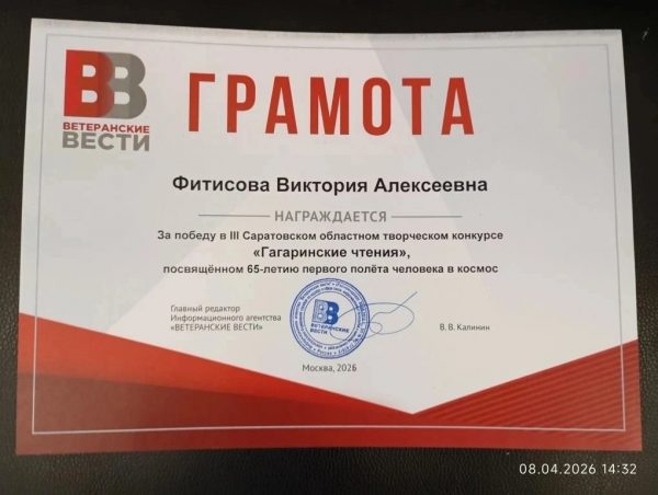 Учащаяся экологического объединения “Радуга” Фитисова Виктория (руководитель Куценко Е.М.) п/к по месту жительства “Ровесник” (расположенный по адресу ул. Безымянная д.6) стала победительницей III Саратовского областного творческого конкурса “Гагаринские чтения” на призы депутата Саратовской областной Думы, ветерана боевых действий, полковника запаса Вячеслава Калинина.