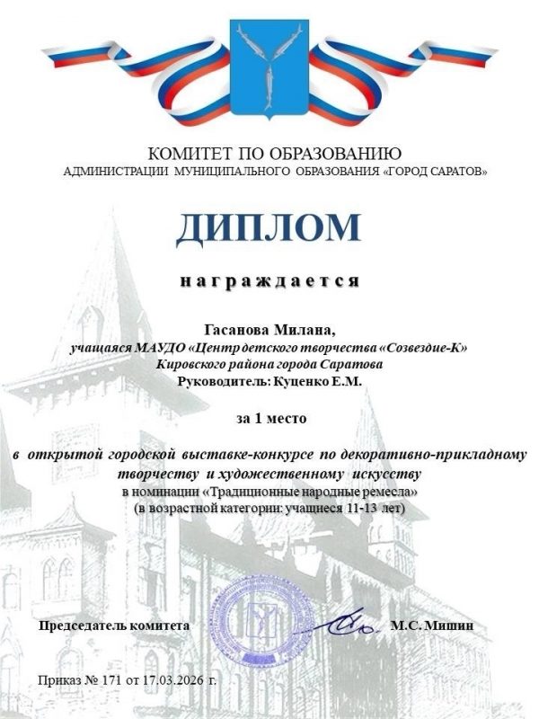 Гасанова Милана экологическое объединение “Радуга” (руководитель – Куценко Е.М.) заняла 1 место в номинации “Традиционные народные ремесла” среди учащихся 11–13 лет;