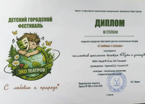 Учащиеся экологического объединения “Радуга” (руководитель Куценко Е.М.) п/к по месту жительства “Ровесник” (расположенный по адресу ул. Безымянная, д.6), МАОУ “Лицей № 24 им. М.М. Расковой”, в рамках реализации воспитательной модели экологической направленности “Я И ПРИРОДА”, стали участниками открытого городского фестиваля детских экологических театров “С любовью к природе” и награждены Дипломом III степени.