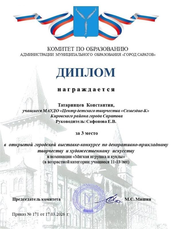 Татаринцев Константин мастерская “Мягкая игрушка” (руководитель Сафонова Е.В.) занял 3 место в номинации “Мягкая игрушка и куклы” среди учащихся 11-13 лет.